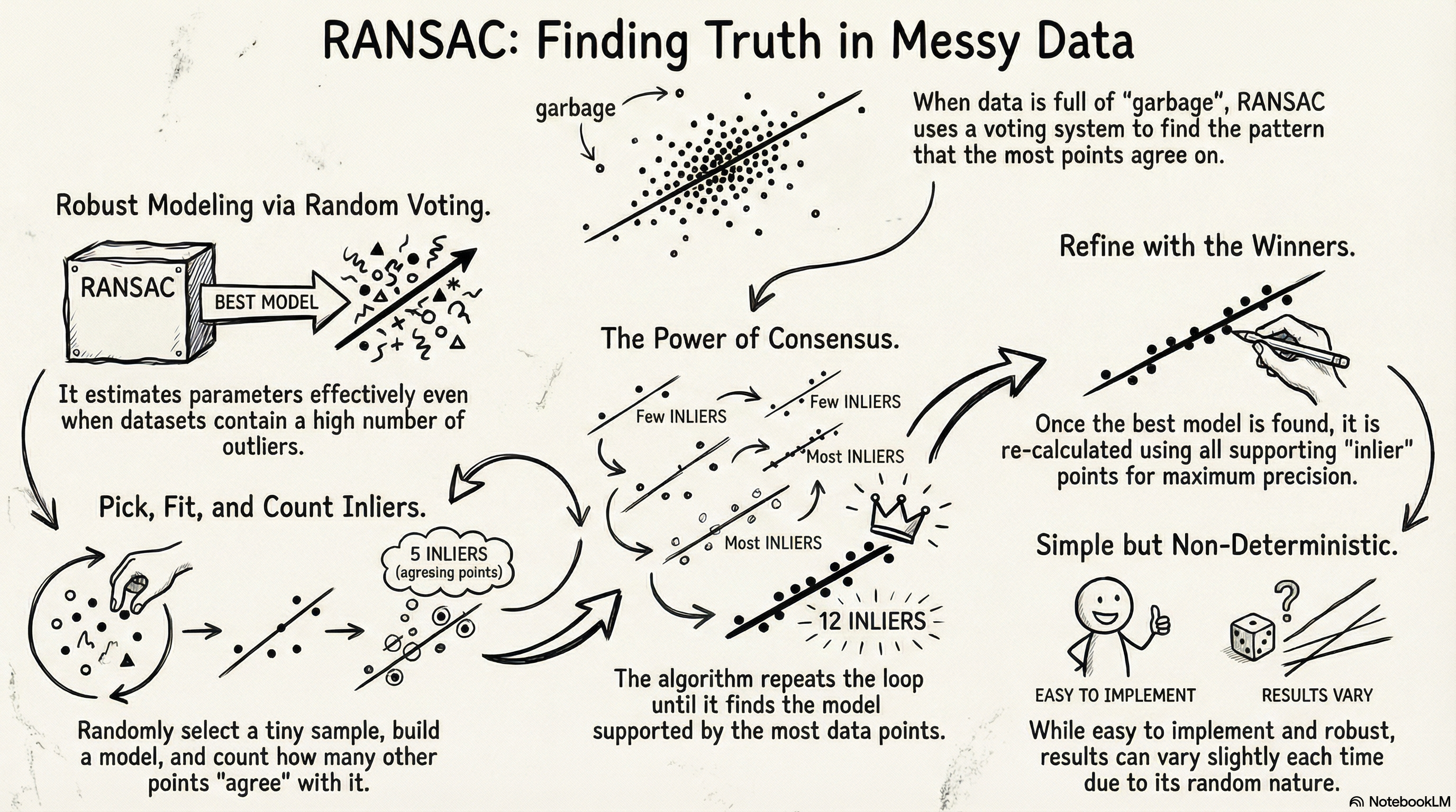 RANSAC (RANdom SAmple Consensus)는 많은 수의 이상치(outlier)가 있는 dataset에서도