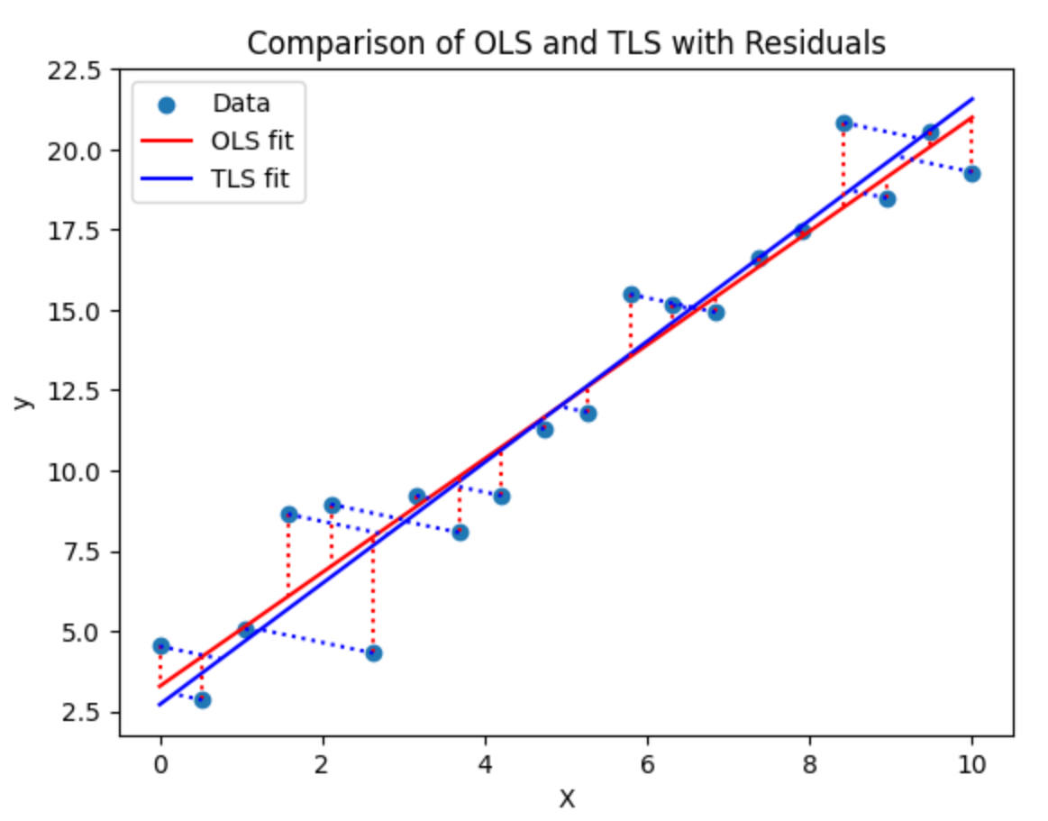 - TLS (Total Least Squares)는 독립 변수 $\mathbf{X}$와 종속 변수 $\mathbf{y}$ 모두에 오차가 포함되어 있다고 가정하며, 이 모든 오차를 최소화함.