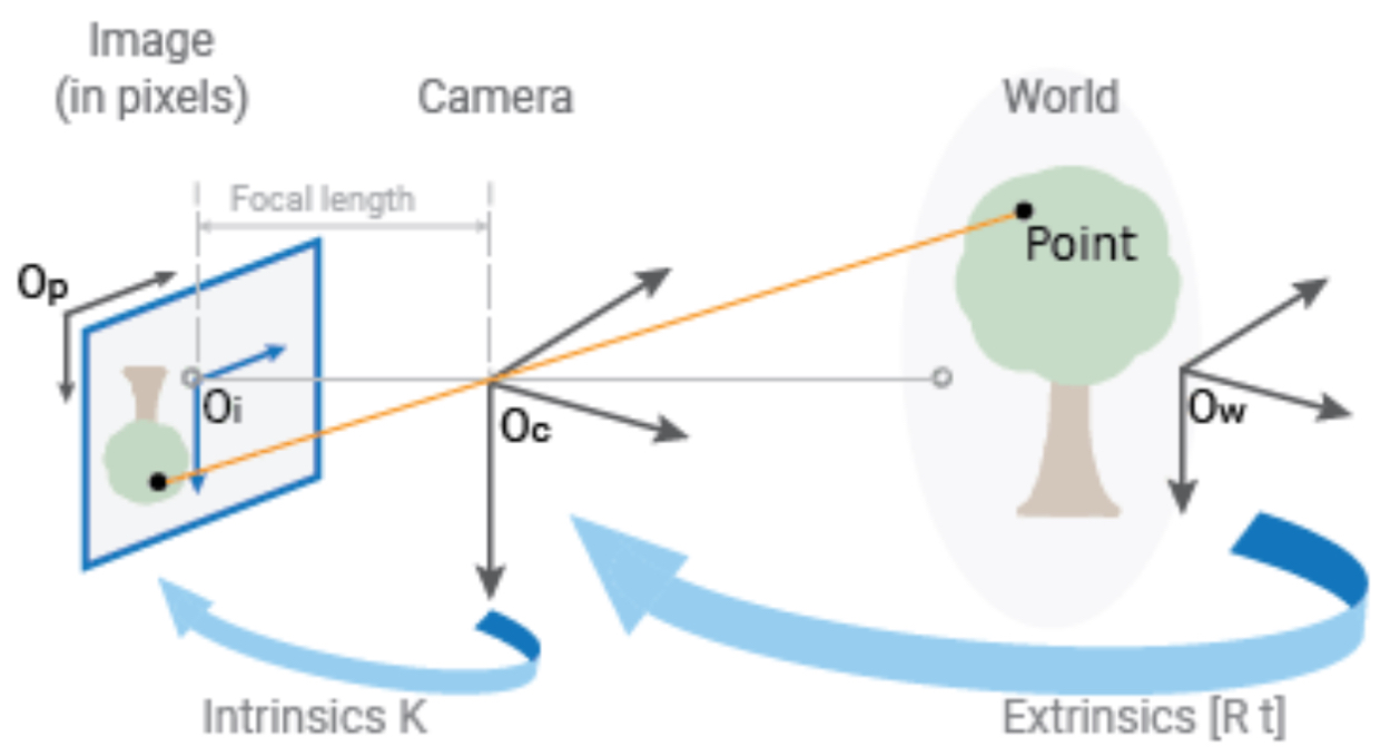 $$w\begin{bmatrix}u \\ v \\ 1 \end{bmatrix} = \color{red}{\mathbf{K}} \begin{bmatrix} \mathbf{R} & \color{blue}{\textbf{t}} \end{bmatrix} \begin{bmatrix} x \\ y \\ z \\ 1 \end{bmatrix} = \color{red}{\begin{bmatrix} f_x & s & u_o \\ 0 & f_y & v_o \\ 0 & 0 & 1 \end{bmatrix}} \begin{bmatrix} r_{11} & r_{12} & r_{13} & \color{blue}{t_x} \\ r_{21} & r_{22} & r_{23} & \color{blue}{t_y} \\ r_{31} & r_{32} & r_{33} & \color{blue}{t_z}\end{bmatrix} \begin{bmatrix} x \\ y \\ z\\ 1 \end{bmatrix} $$