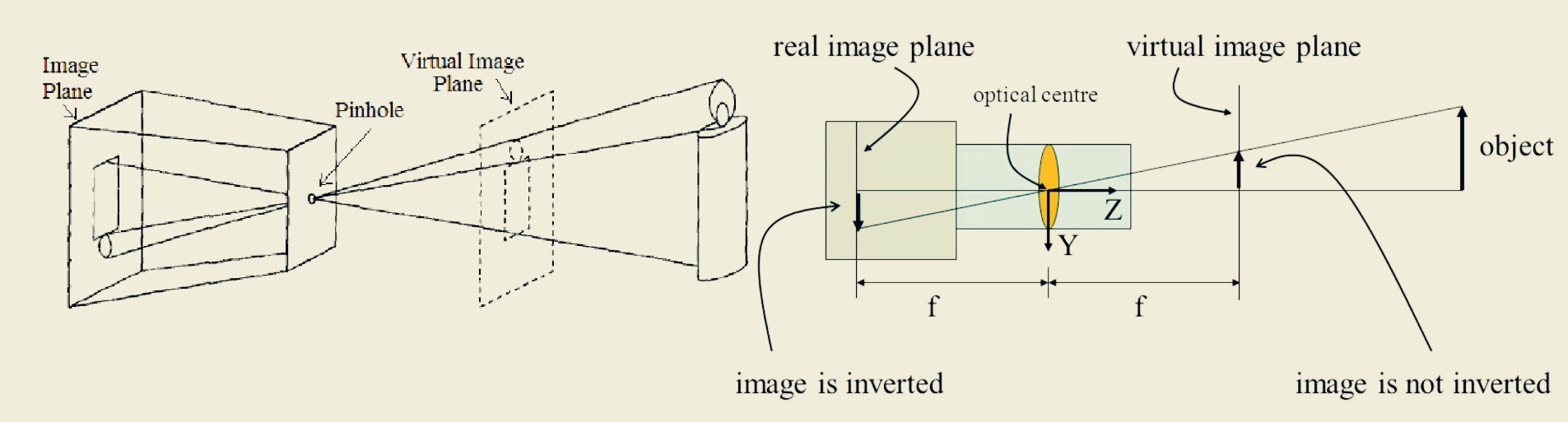 - 빛이 핀홀을 통해 들어와서 실제 이미지를 형성하는 평면: 뒤집혀지기 때문에 virtual image plane이 보다 많이 사용됨.