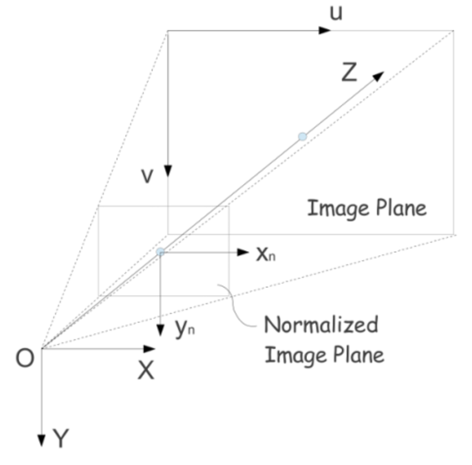 Image Plane에서의 coordinate $x_i, y_i$는mm단위를 가지며결과 image의 coordinate라고 생각할 수 있다.하지만 계산의 용이성 때문에 $x_i, y_i$ 보다는normalized image plane의 coordinate $x_n, y_n$ 이 많이 사용된다.현