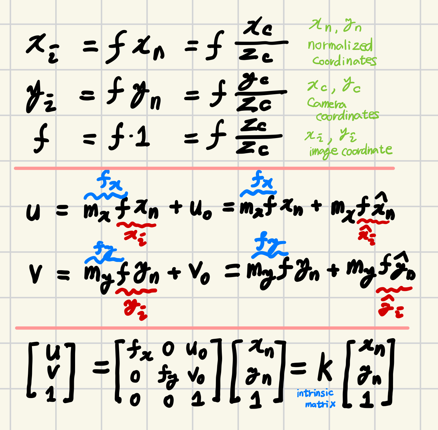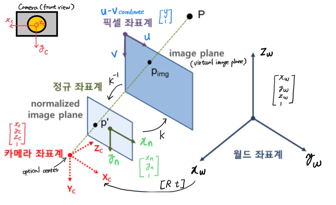 - normalized image plane(정규화 이미지 평면)에서 실제 디지털 센서 (픽셀) 좌표계로 변환한 것임: $K$를 통해 변환됨.