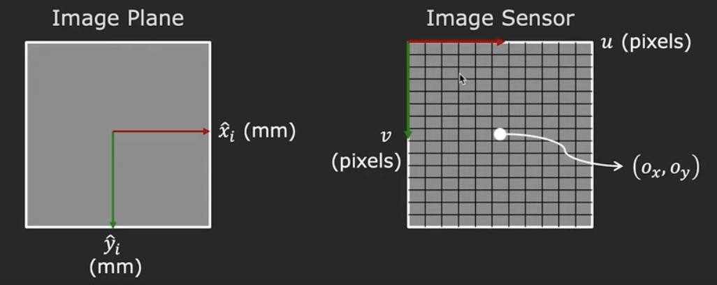 다음 그림은 image plane coordinate와 sensor coordinate 를 나타냄: 같은 plane을 대상으로 다르게 표현한 것!