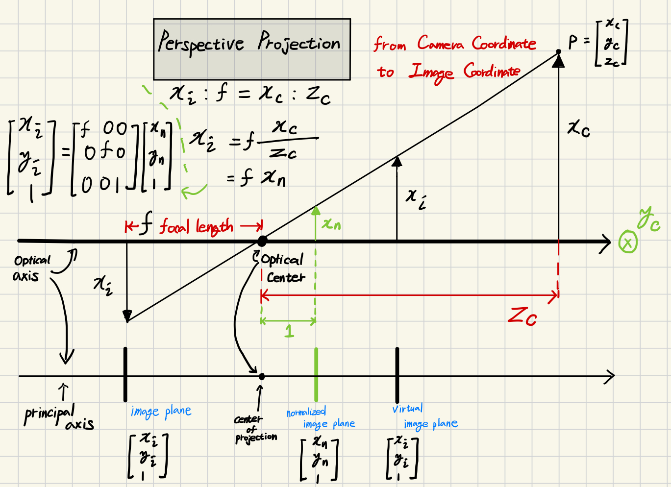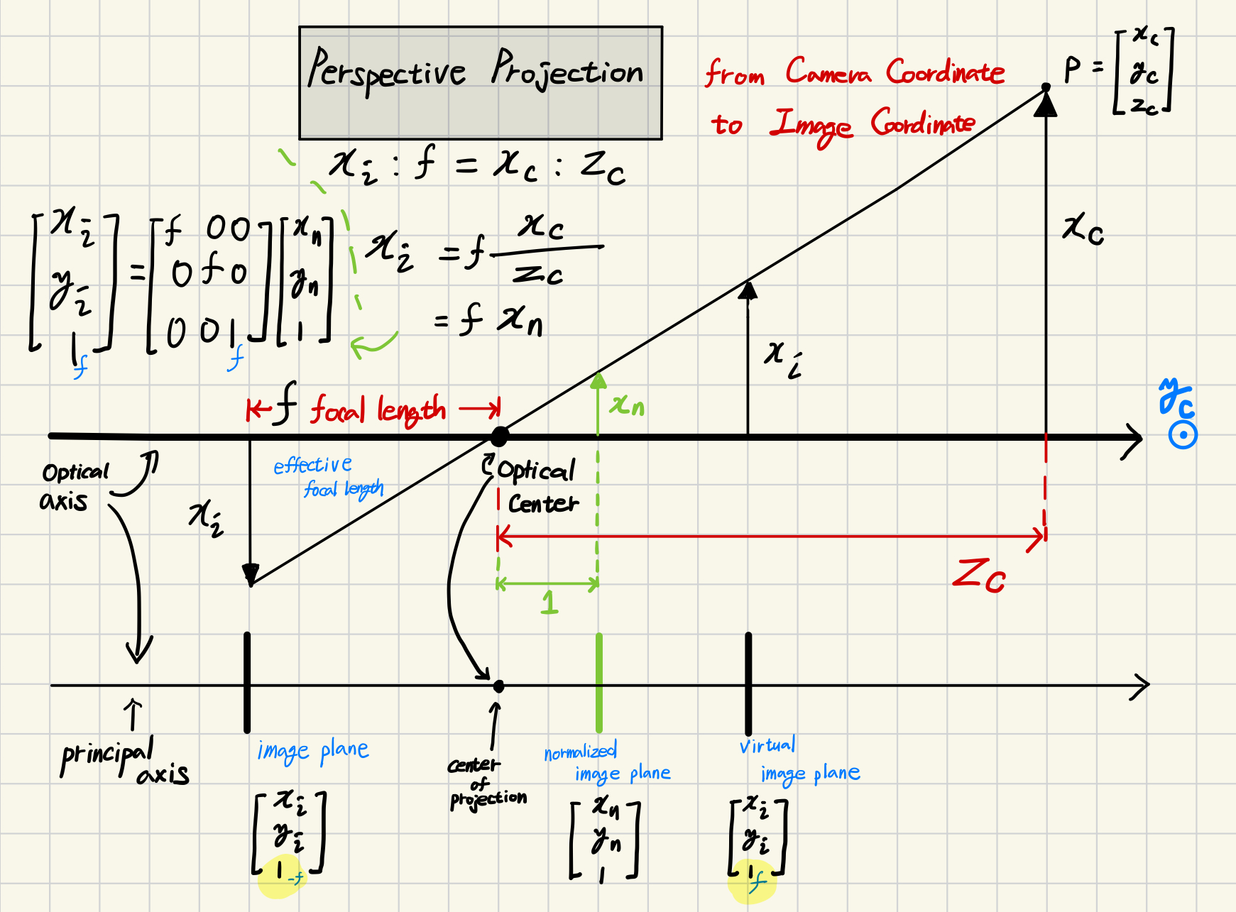 Image Plane에서의 coordinate $x_i, y_i$는mm단위를 가지며결과 image의 coordinate라고 생각할 수 있다.하지만 계산의 용이성 때문에 $x_i, y_i$ 보다는normalized image plane의 coordinate $x_n, y_n$ 이 많이 사용된다.현