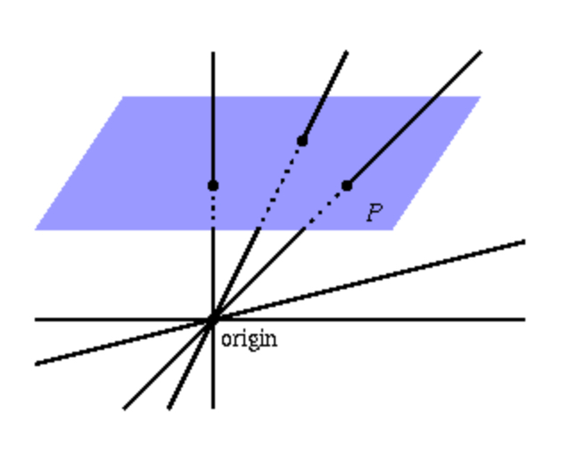 - scalar mutiple equivalent calss $\sim$에 대한 quotient space임: $\textbf{x} ~\lambda \textbf{x}, \lambda \ne 0$