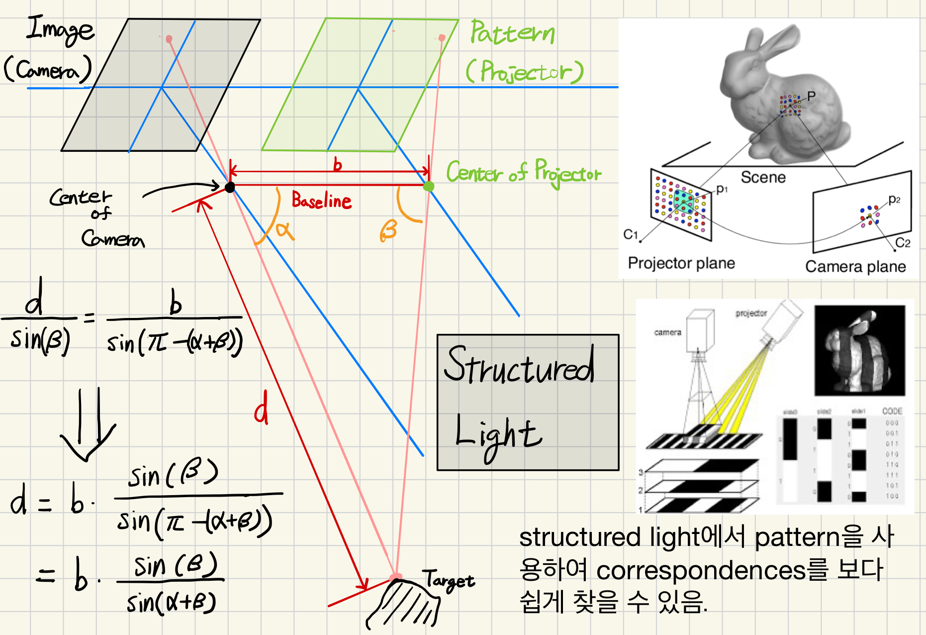 Passive Stereo Vision에서 사용되는 triangulation이 역시 함께 사용됨.