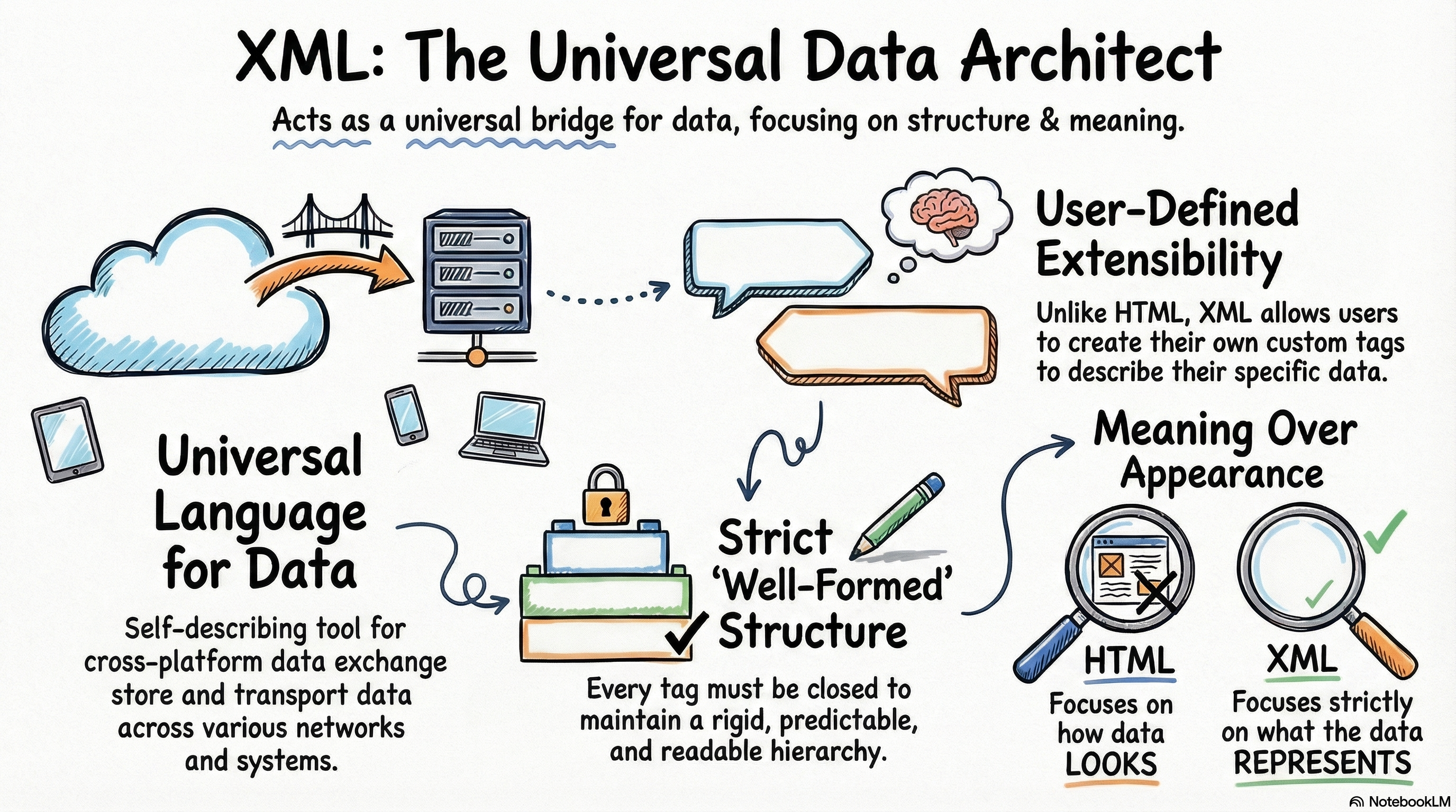 데이터를 저장하고 전송하기 위해 설계된 범용 마크업 언어(Universal markup language )임.