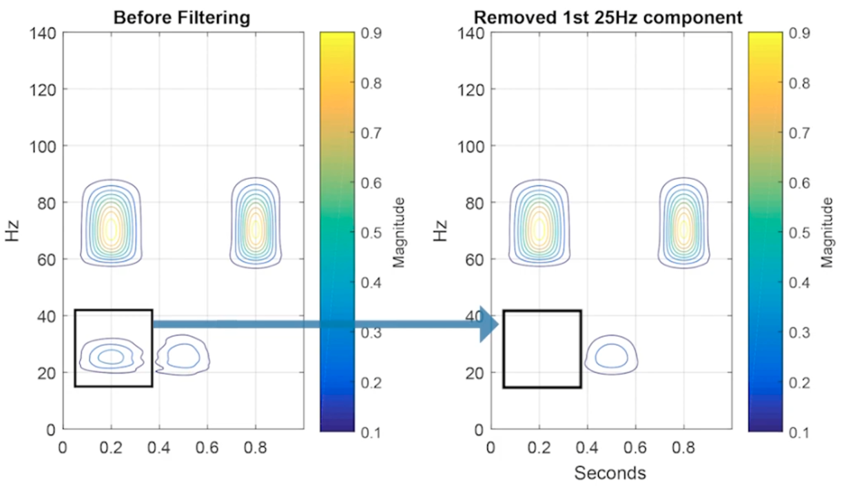 - 위의 경우 0.4초 이전에 존재하던 20-40Hz 의 주파수 성분을 선택적으로 필터링함.