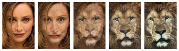 두 image간에 대응되는 특징점들을 추출하여 mesh를 만들고 이들을 이용하여 부드럽게 전환이 되도록하는 게 일반적이지만,