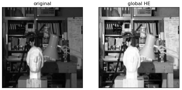 아래 그림에서 조명이 불균일하여 global HE가 효과가 좋지 않음을 보여줌 (석고상의 대비가 오히려 나뻐짐)