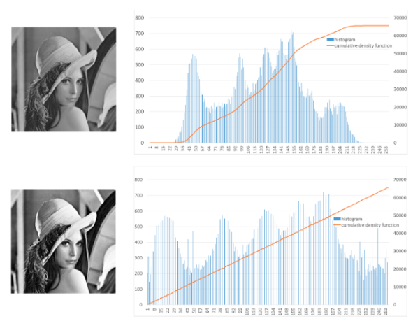 이 과정을 통해, 이미지의 픽셀 값들이 조정되고, 보다 고르게 분포된 히스토그램을 갖게 되어 최종적으로 명암 대비가 향상된 이미지를 얻을 수 있음.