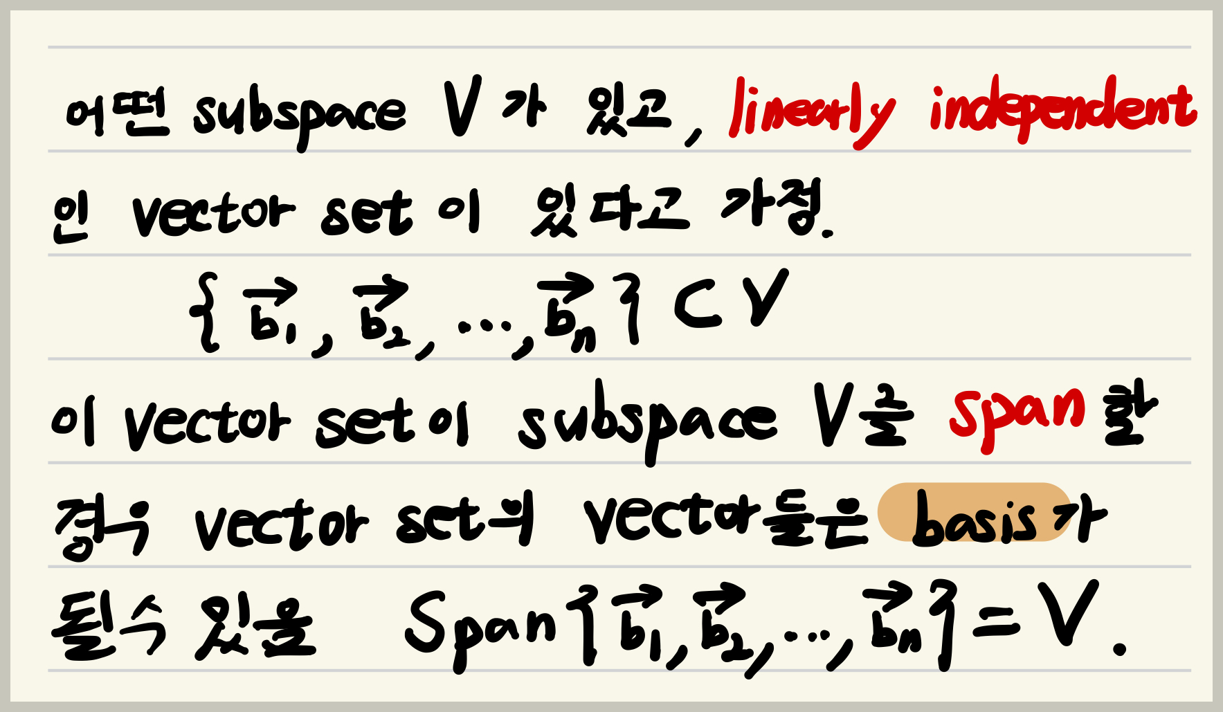 - basis들의 선형 결합으로 벡터 공간의 모든 벡터를 표현할 수 있어야 함.