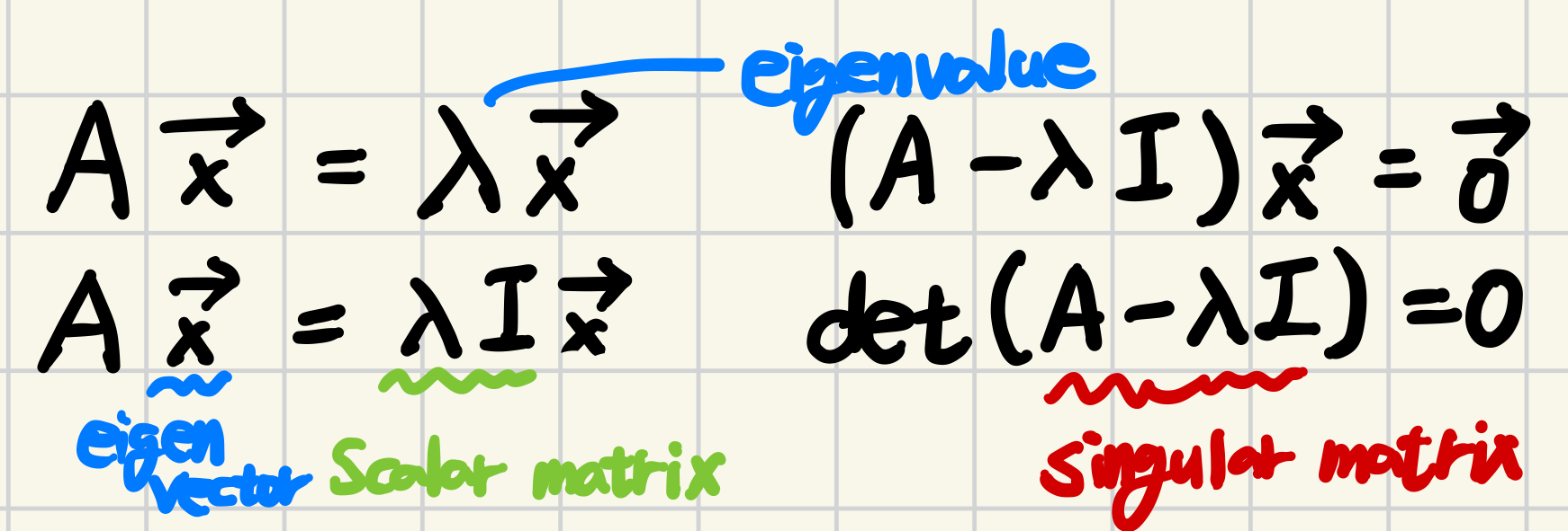 $$\begin{aligned}A\mathbf{x} &= \lambda \mathbf{x} \\ A\mathbf{x} &= \lambda I \mathbf{x} \\ (A-\lambda I) \mathbf{x} &= \mathbf{0} \\ \det (A- \lambda I) &= 0\end{aligned}$$