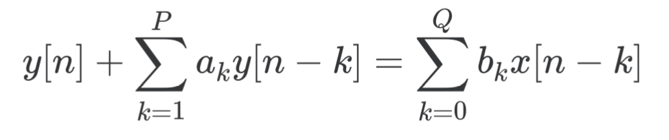 $$y[n] = - \sum_{k=1}^{P} a_k y[n - k] + \sum_{k=0}^{Q} b_k x[n - k]$$