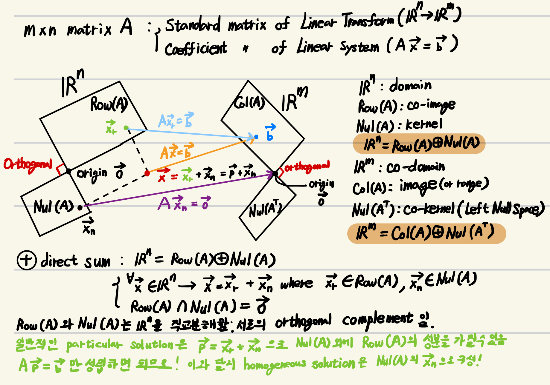 - $\mathbf{x}_r \in \text{Row}(A)$: Row space의 벡터로 particular solution을 통해 얻어짐.