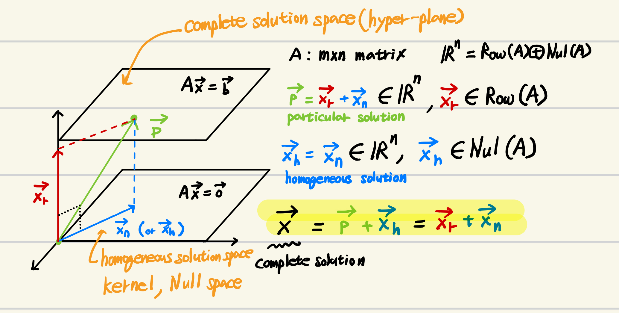 - $A\mathbf{x}=\mathbf{b}$의 solution space(=일종의 hyper plane)를 구할 수 있음.
