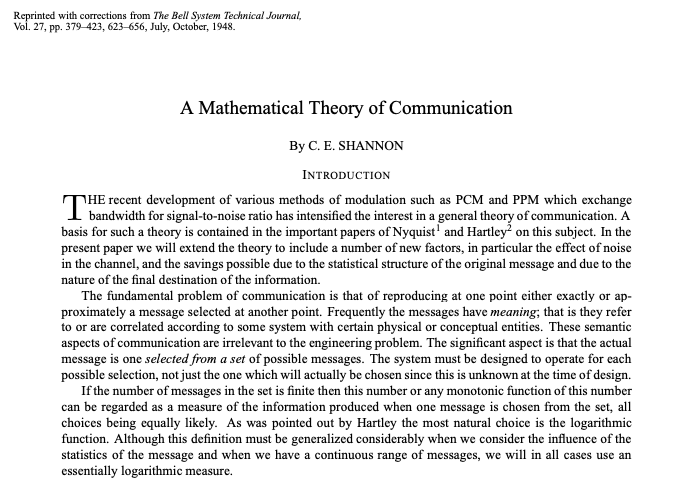 A Mathematical Theory of Communication 은 Claude Shannon이 1948년에 발표한 유명한 논문의 제목임.