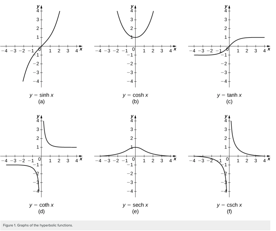 - trigonometric functions는 단위원(circle, $x^2 + y^2 = 1$)과 관련이 있는 것과 달리, hyperbolic functions는 쌍곡선 ($x^2 - y^2 = 1$ )과 관련이 있음.