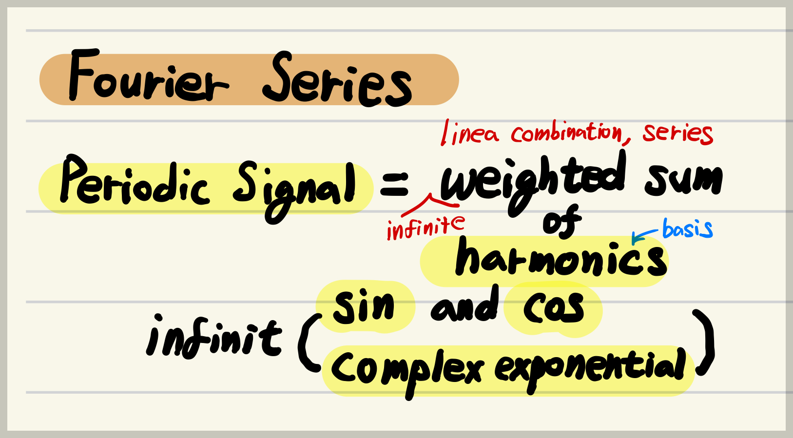 - fundamental frequency의 정수배에 해당하는 harmonics에 대한 cosine과 sine (또는 이를 조합한 complex exponential)을