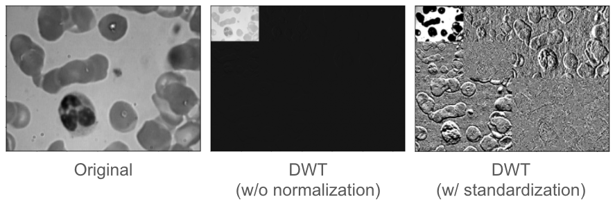 실제 이미지를 이용한 예는 다음과 같음 (가운데 DWT):