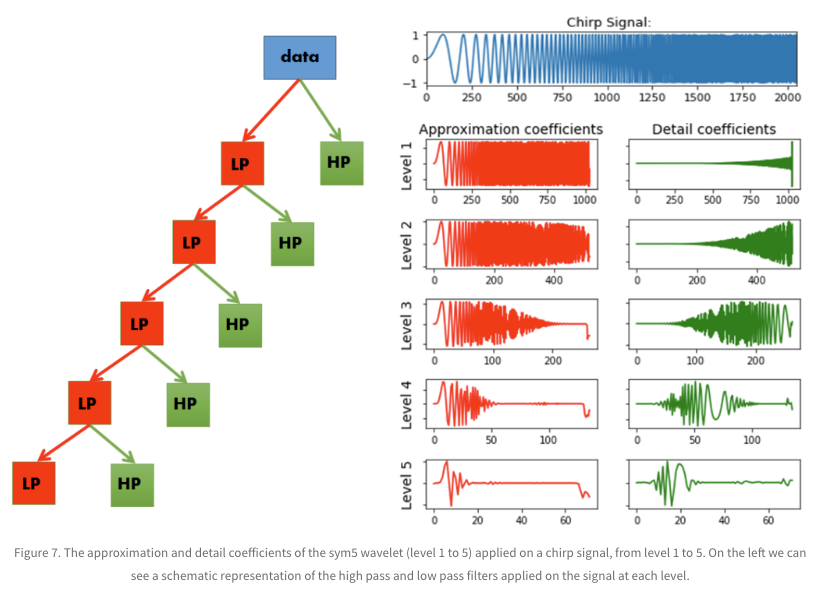 (filter bank 관점에서, decomposition의 level이 올라갈수록 low freq.부분이 점점 더 세밀하게 분해됨을 의미함)