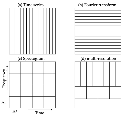 다음은 time-frequency analysis에서 resolution과 uncertainty를 보여주는 그림임: