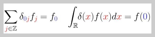 | $ \underset{\varepsilon \to 0}{\lim} \delta_\varepsilon(t) = \infty,\quad t = 0 $ | $ \delta[0] = 1 $ |