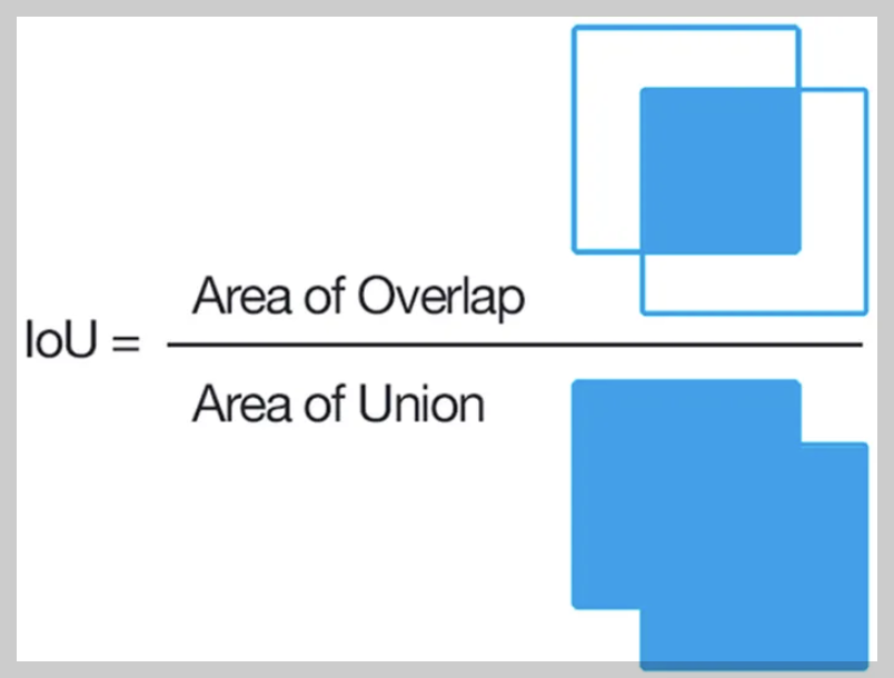 $$ \begin{aligned}\text{IoU}&=\frac{\text{Intersection}}{\text{Union}}\\&=\frac{TP}{FP+TP+FN}\end{aligned} $$