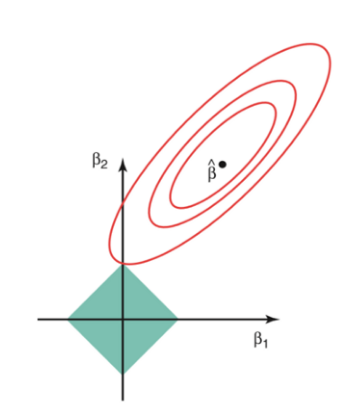 - L1 제약(Lasso): 마름모(diamond) 형태