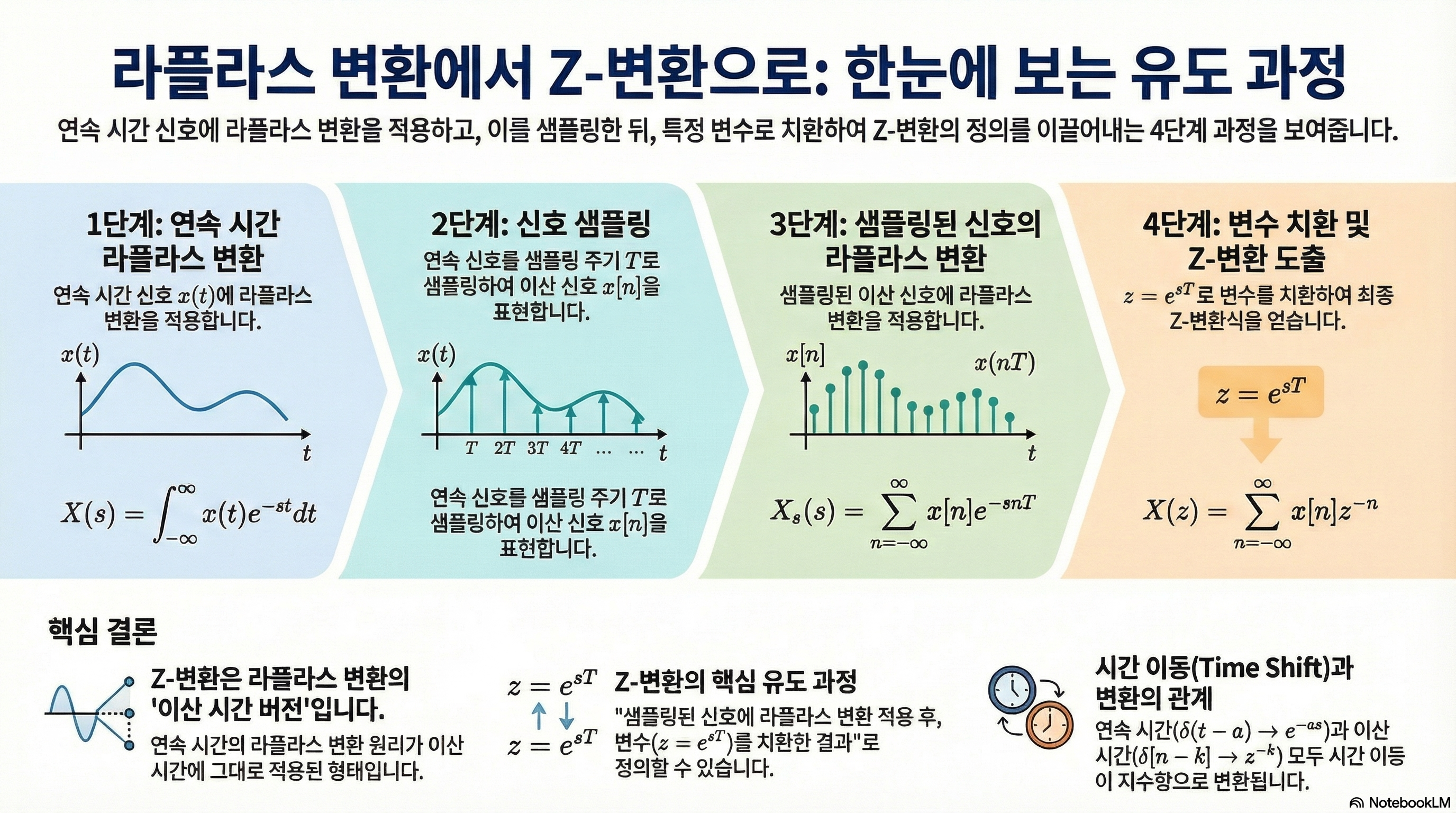 - 시간 이동이 지수항으로 변환되는 동일한 원리가 연속시간(Laplace) 과 이산시간(z-transform) 모두에서 유지되며 이와 치환이 같이 적용된 결과가 z-Transform임.