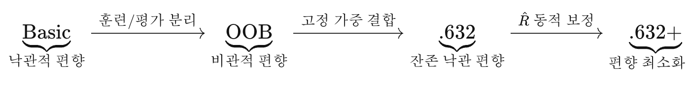 $$\underbrace{\text{Basic}}_{\text{낙관적 편향}} \xrightarrow{\text{훈련/평가 분리}} \underbrace{\text{OOB}}_{\text{비관적 편향}} \xrightarrow{\text{고정 가중 결합}} \underbrace{\text{.632}}_{\text{잔존 낙관 편향}} \xrightarrow{\hat{R}\text{ 동적 보정}} \underbrace{\text{.632+}}_{\text{편향 최소화} \checkmark}$$