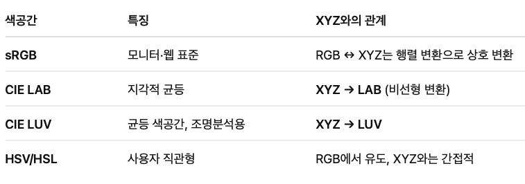 - 여러 가지 color space 중, CIE XYZ 는 인간의 색채 인지를 직접 측정하여 color을 수학적으로 정의한 최초의 표준 color space임.