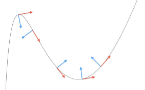 Tangent vector (derivative of vector function)를 자신의 norm (크기,L2-norm)으로 나눈 것.