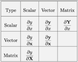 - Matrix Calculus에서는 총 9개의 형태의 derivatives가 있음: 아래 그림 참고.